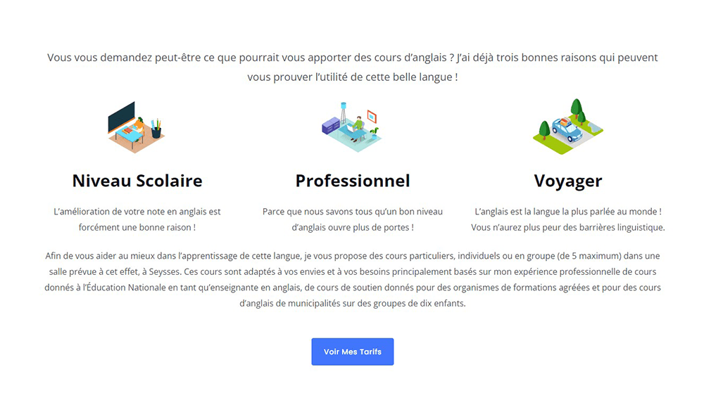 Marianne m’a contacté pour la création d’un site vitrine très simple, qui viserait à promouvoir son activité de professeur d’anglais dans la région de Toulouse et ses environs.